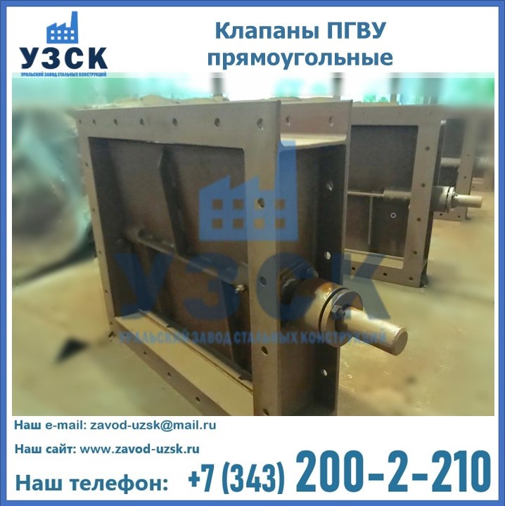 Прямоугольный клапан ПГВУ имеет прямоугольную или квадратную форму, по основному сечению конструкции, на которую устанавливается клапан. Для изготовления в Капшагае применяются сталь или чугун, в зависимости от модели. Внутри клапана имеется запорный элемент, передвигающийся параллельно общему потоку движения среды. Шибер ПГВУ имеет такую же форму, как и основное сечение. Перемещение створки происходит благодаря возвратно-поступательным движениям.